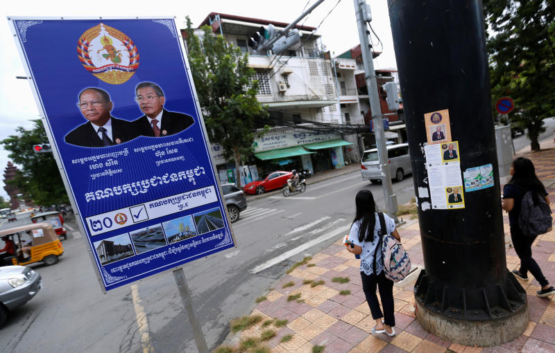 Election posters for the Cambodian People's Party (CPP) and FUNCINPEC Party are seen in Phnom Penh on July 17, 2018.