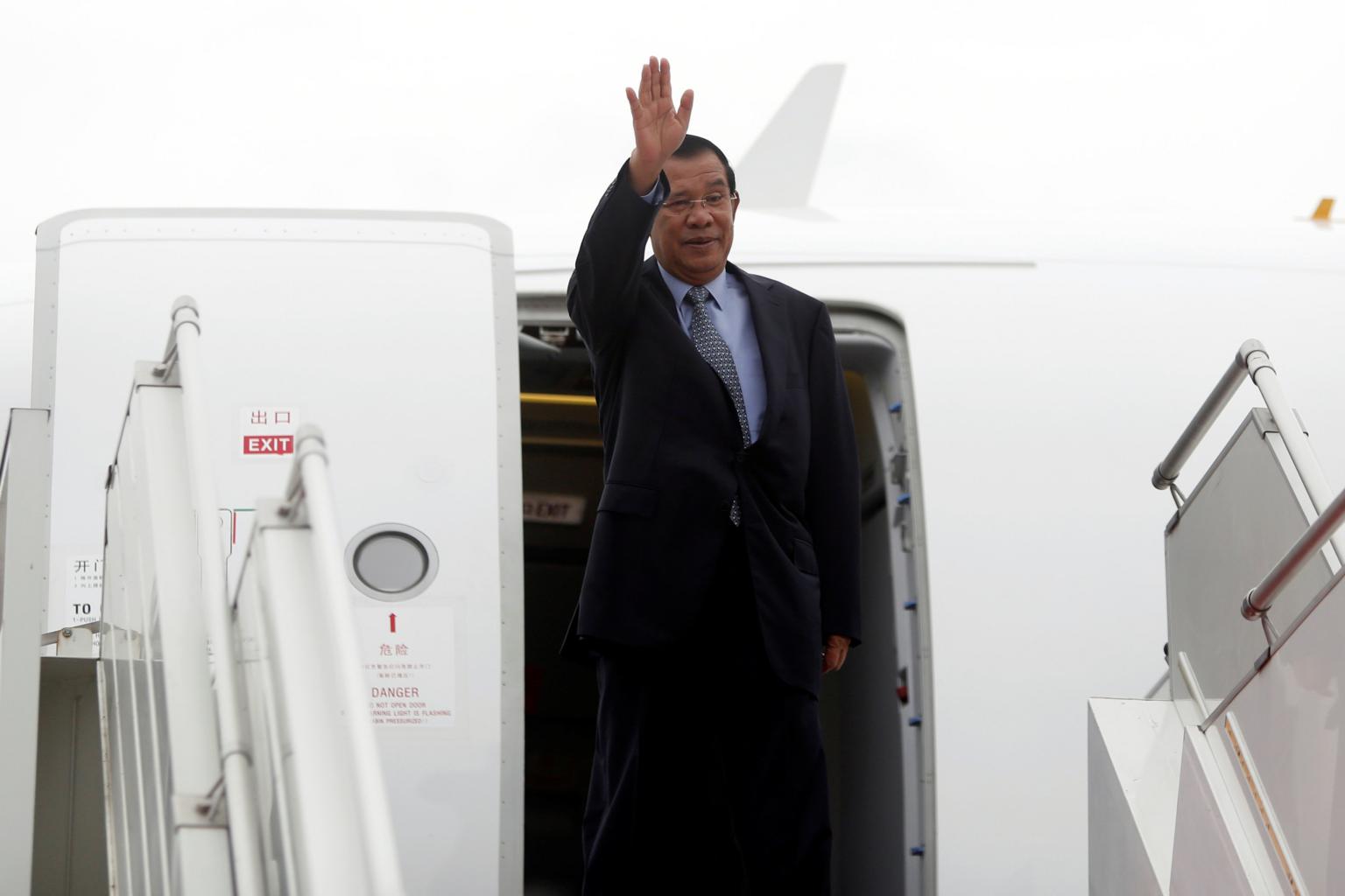 Cambodia's Prime Minister Hun Sen arrives at Phnom Penh International Airport before flying to China.