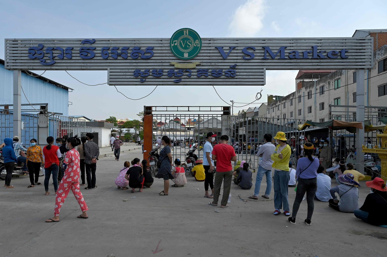 People waiting to take a Covid-19 test at a market in Phnom Penh, on May 3, 2021.