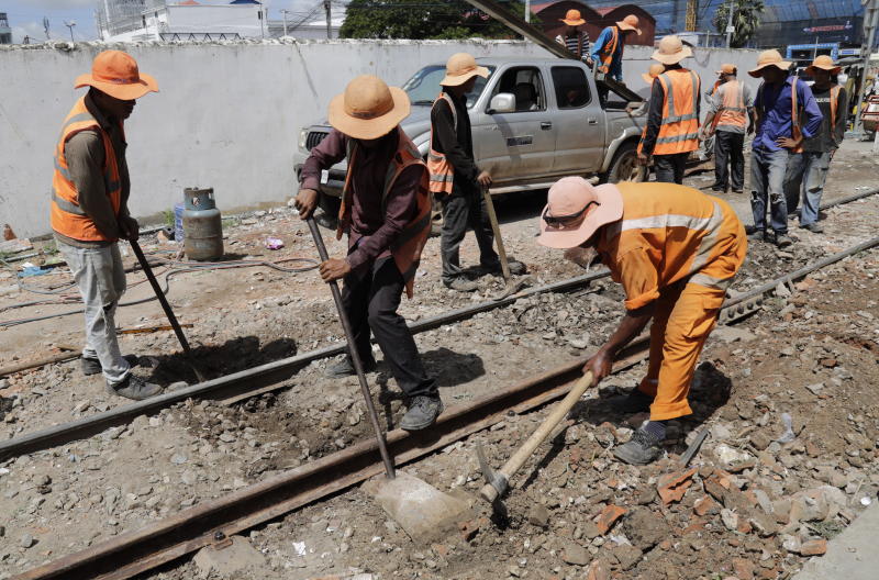 Cambodian labourers work at a railway near a train station in Phnom Penh, Cambodia, on July 4, 2018.