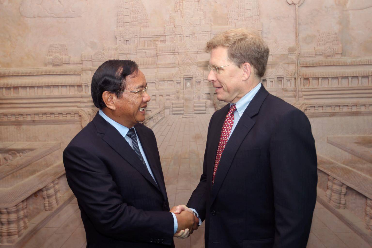 US Deputy Assistant Secretary of State for Southeast Asia Patrick Murphy (right) shakes hands with Cambodian Foreign Minister Prak Sokhon before a meeting at the Ministry of Foreign Affairs and International Cooperation in Phnom Penh, Cambodia on April 25, 2017.