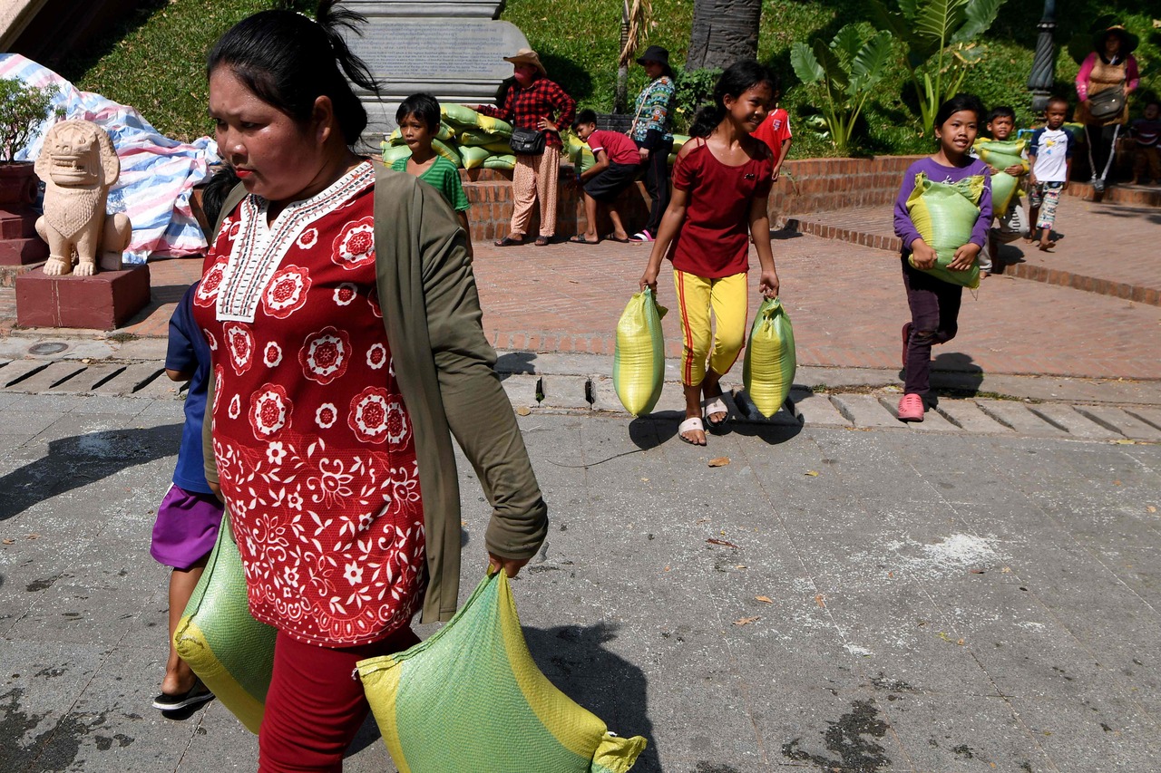 A photo taken on March 13, 2020, shows people carrying sacks of rice donated by a Vietnamese woman at Wat Phnom, which is a tourist site and a Buddhist shrine, in Phnom Penh.