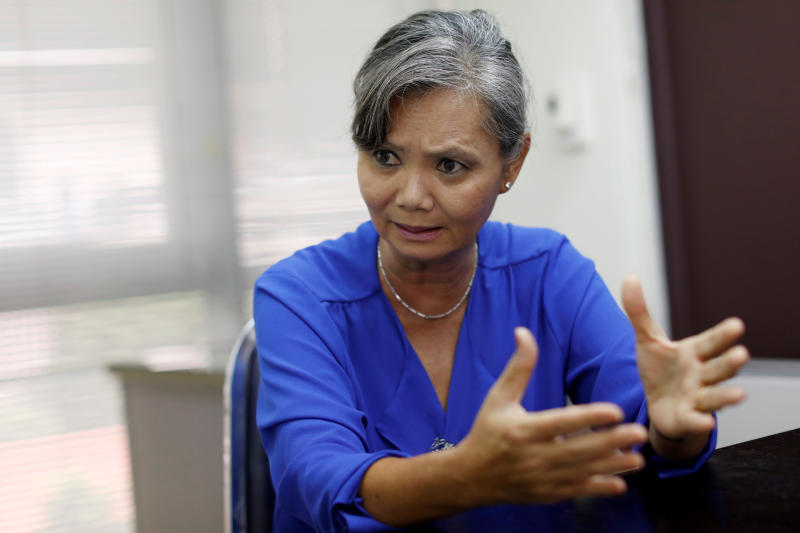 In a photo taken on Oct 4, 2017, Mu Sochua speaks during an interview with Reuters.