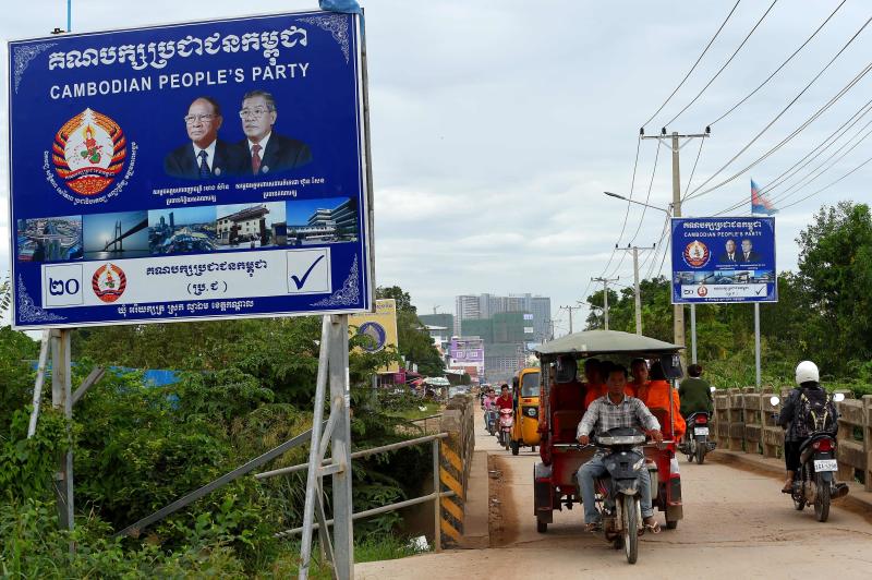 Commuters pass the billboard of the ruling Cambodian People's Party bearing the portraits of Cambodia's strongman Premier Hun Sen (right) and National Assembly President Heng Samrin in Kandal province on Aug 15, 2018.