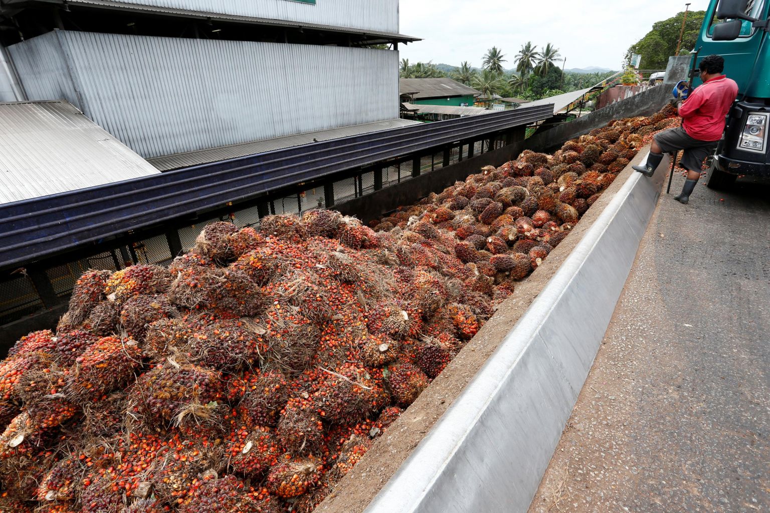 A worker unloads palm oil fruit bunches from a lorry inside a palm oil mill in Bahau, Negeri Sembilan, Malaysia on Jan 30, 2019.
