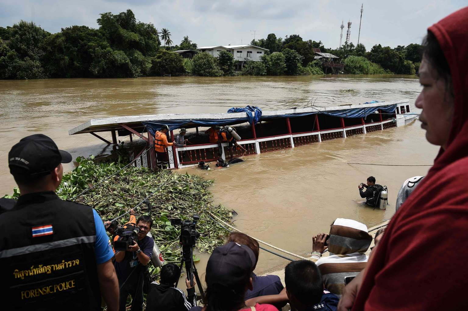 Rescue workers look for missing persons on a ferry which capsized the day before in the province of Ayutthaya.