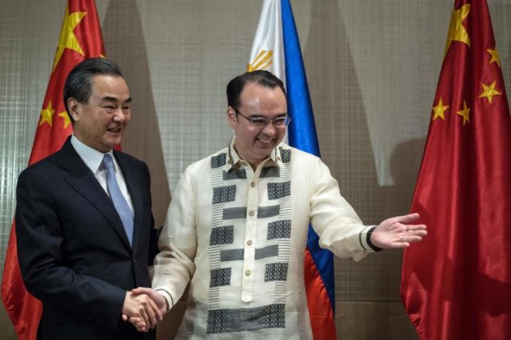 China's Foreign Minister Wang Yi (left) shakes hands with Philippine Foreign Affairs secretary Alan Peter Cayetano after signing the guestbook in Manila on July 25, 2017.