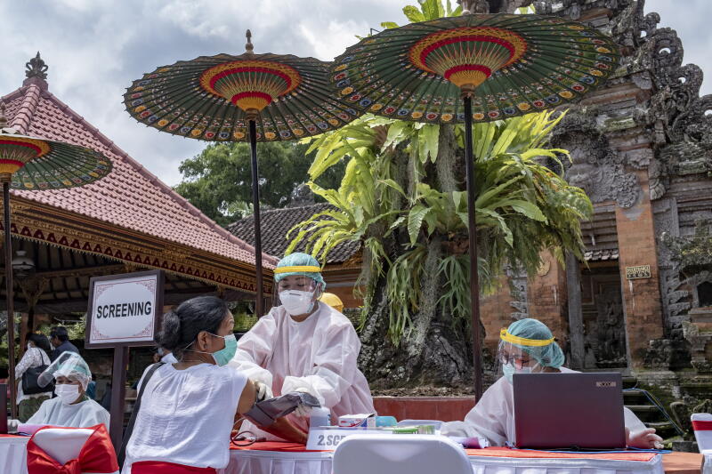 A woman undergoes a medical checkup before receiving a shot of Covid-19 vaccine during a mass vaccination drive in Ubud, Bali on March 16, 2021.