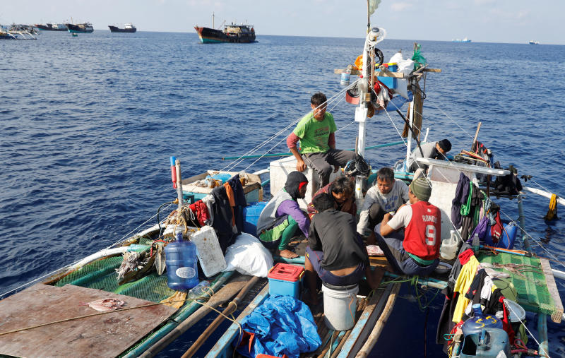 Filipino fishermen eat a meal aboard a fishing boat overlooking Chinese fishing vessels at the disputed Scarborough Shoal on April 6, 2017.