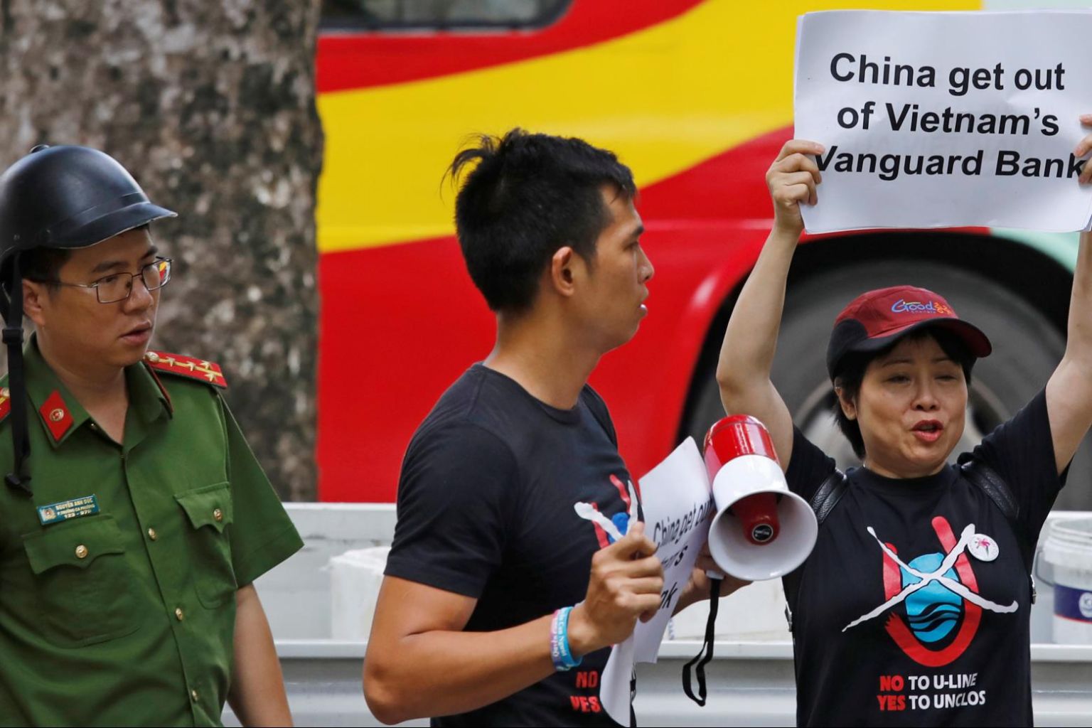 In a photo from Aug 6, 2019, a Vietnamese policeman approaches anti-China protesters as they hold placards during a demonstration in front of the Chinese embassy in Hanoi, Vietnam.