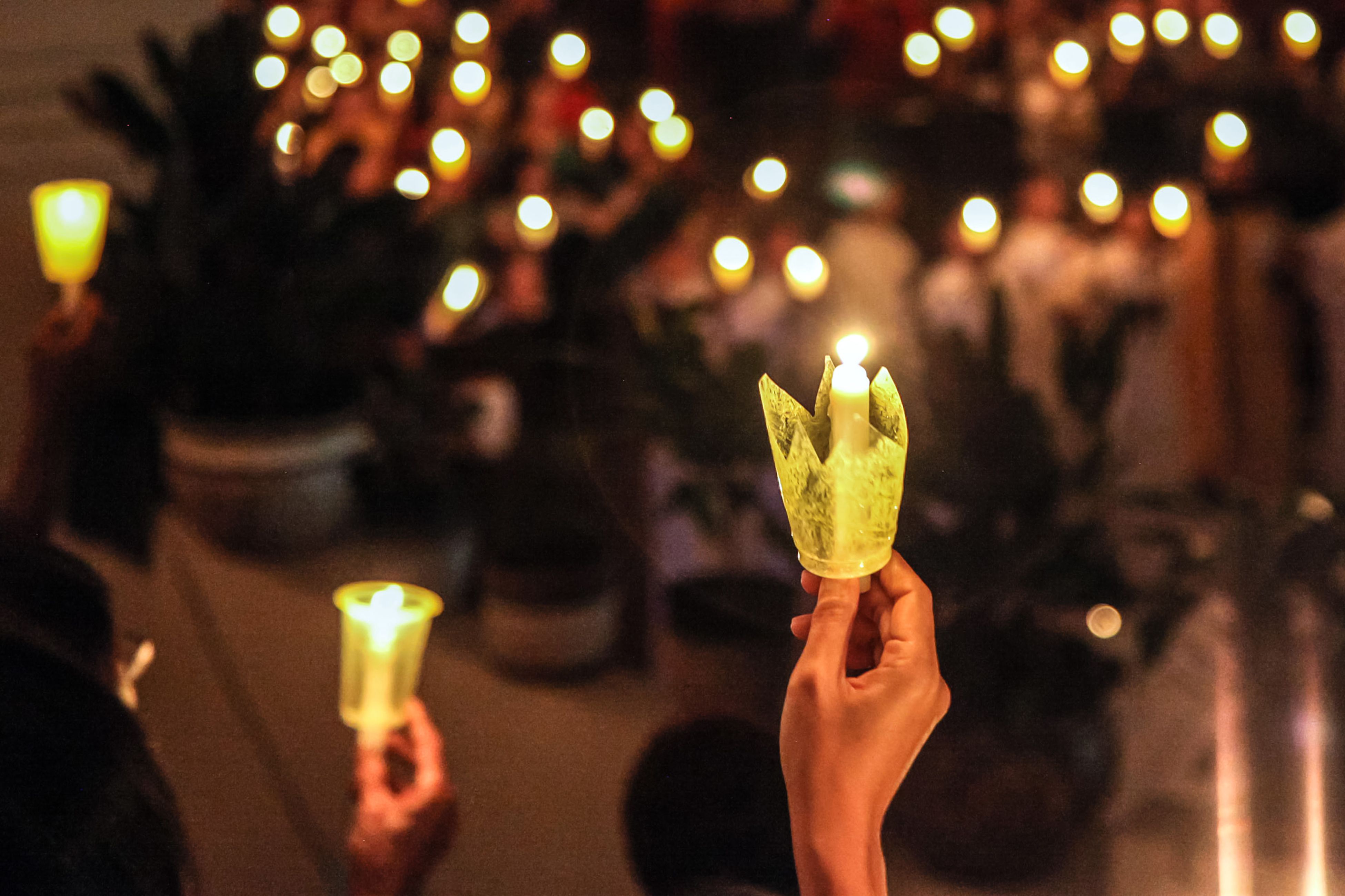 People hold up candles during a Christmas Eve prayer at a church in North Sumatra, Indonesia, on Dec 24, 2019.