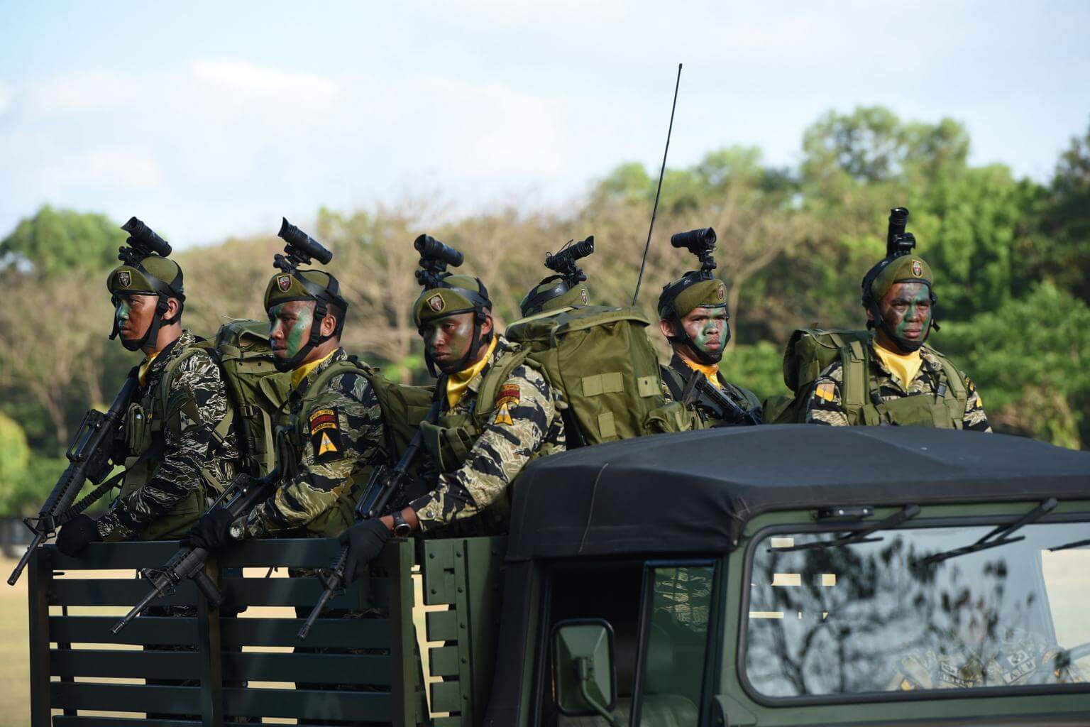 In this photo taken on April 4, 2017 Philippine army soldiers stand aboard a vehicle during a march and review as part of their anniversary celebration at Fort Bonifacio in Manila.