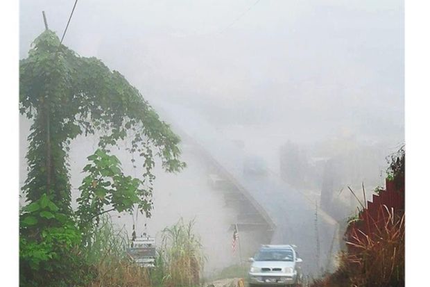 Vehicles emerging from the gloom as thick fog shrouds Gua Musang in Kelantan.
