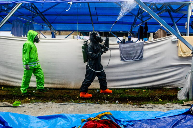 A photo taken on March 19, 2020 shows police officers in protective suits spray disinfectant at a tent where a Muslim mass gathering was supposed to be held in Gowa, South Sulawesi.