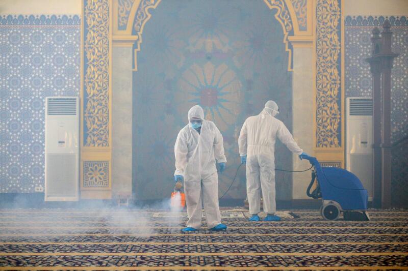 Workers wearing protective suits spray disinfectant at a mosque in Bandar Seri Begawan, Brunei on March 17, 2020.