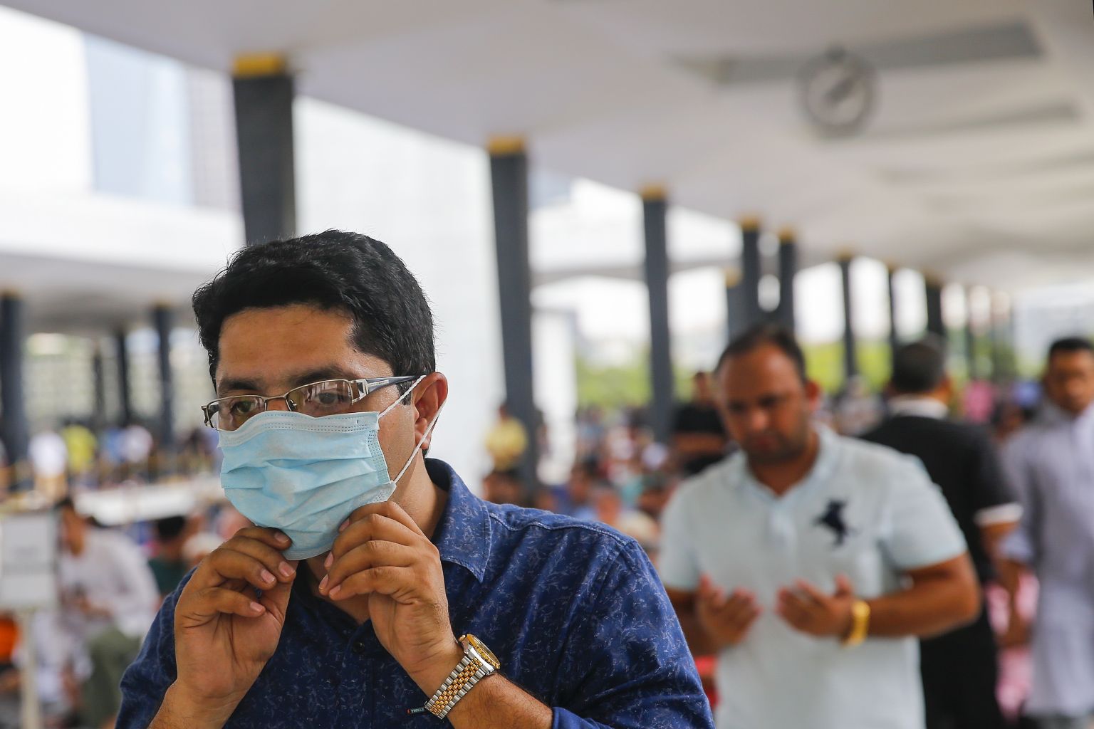 A man wears a mask during Friday prayers at the National Mosque in Kuala Lumpur, March 13, 2020.