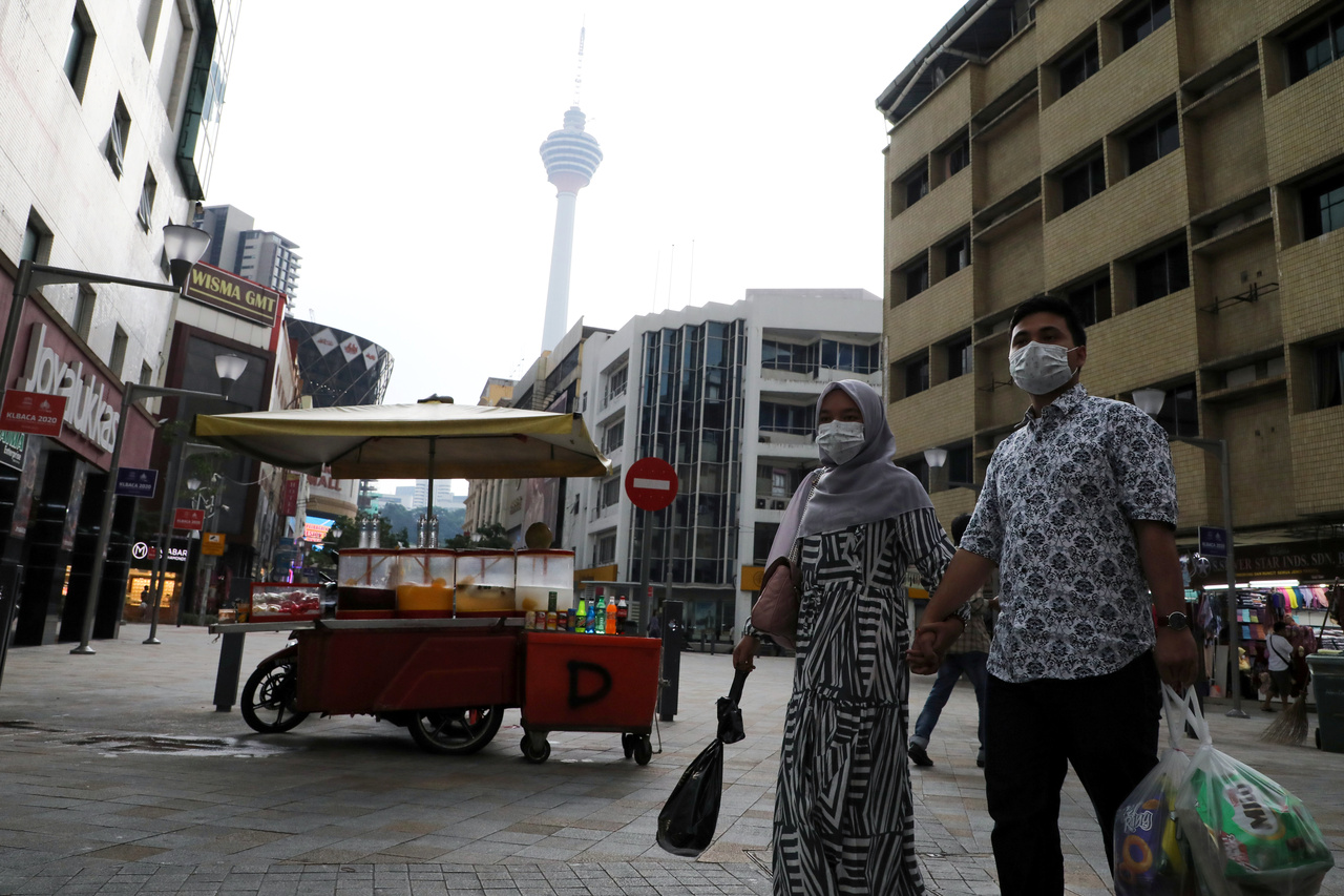 A couple wearing protective face masks cross a street, following the outbreak of the coronavirus in Kuala Lumpur, Malaysia, on March 6, 2020.