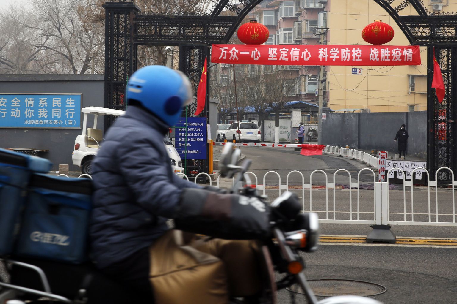 A food delivery man rides his motorcycle past a banner reading "Unite as one, firm confidence, scientific prevention and control, and defeat the epidemic" in Beijing, China.