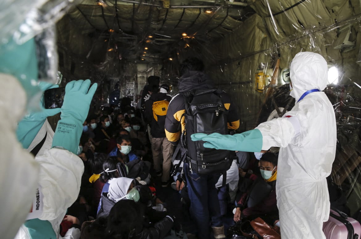 Indonesians evacuated from Wuhan board a military plane to Natuna, Riau Islands, shortly after landing at Hang Nadim Airport in Batam on Feb 2, 2020.