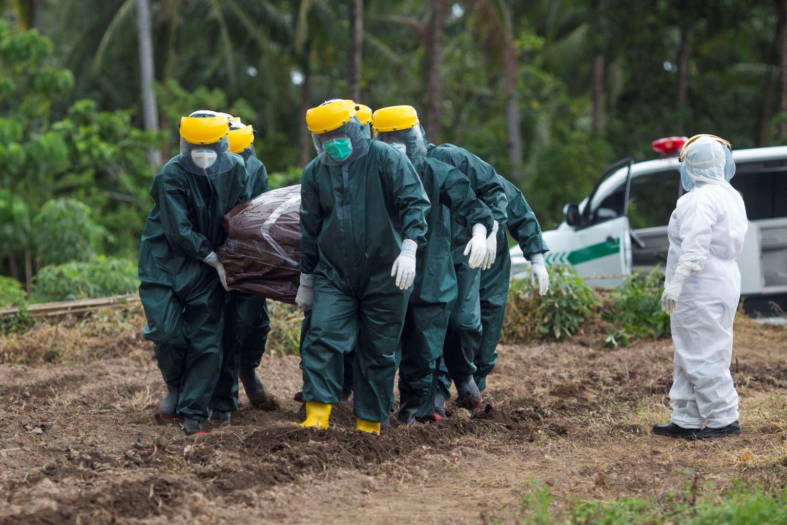 Municipality workers bury a coronavirus victim at a cemetery area in Sangihe Island, North Sulawesi.