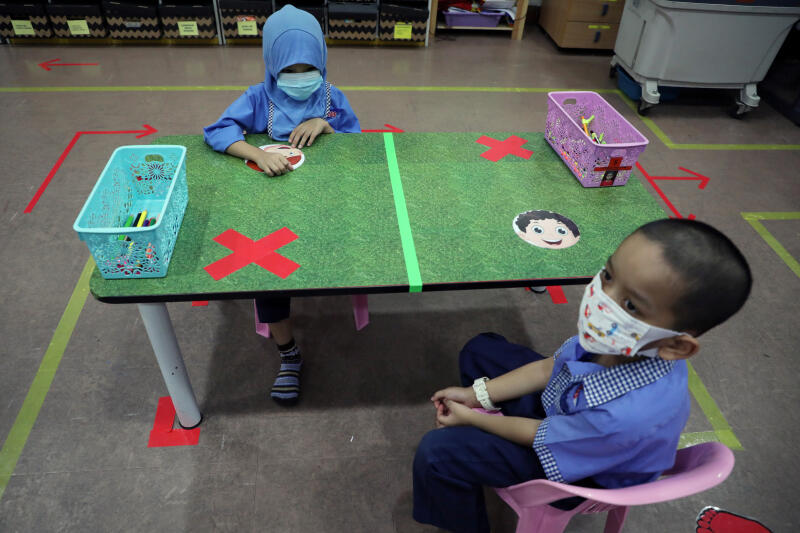 Malaysian kindergartens reopened from Wednesday, with students and teachers wearing masks at all time and practising social distancing measures as they go about their activities.