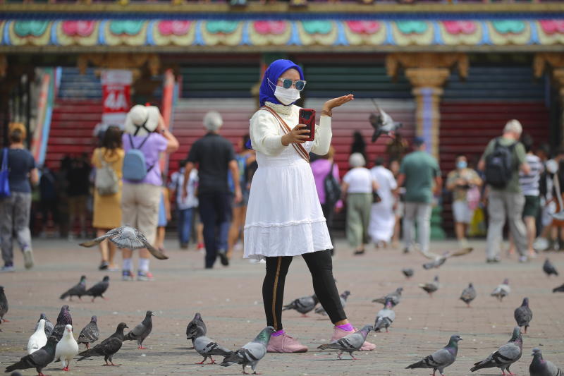 A tourist wears a face mask at the Batu Caves in Kuala Lumpur, Malaysia, on March 5, 2020.
