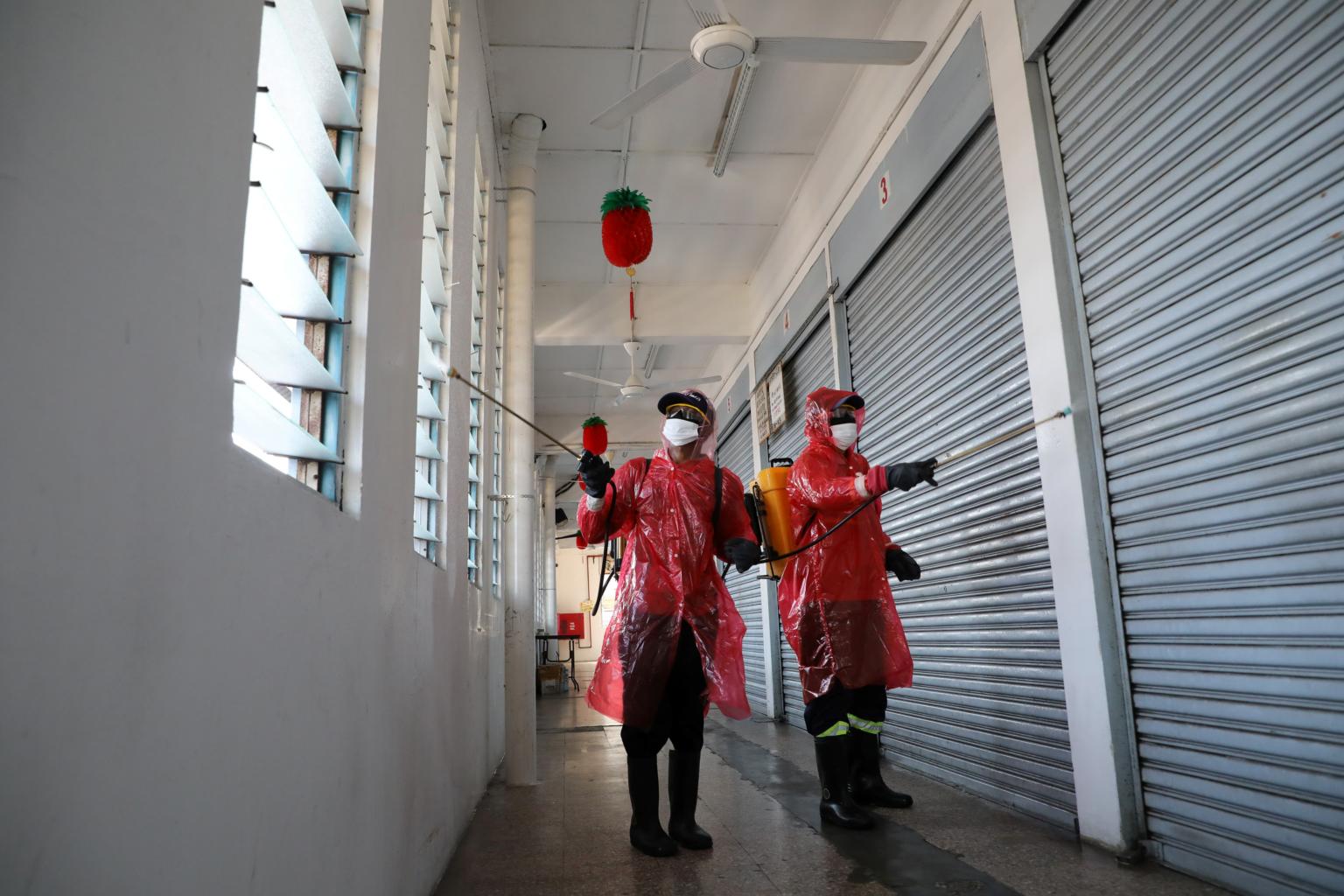 Workers spray disinfectant at a market, which is closed during the movement control order in Kuala Lumpur on March 24, 2020.