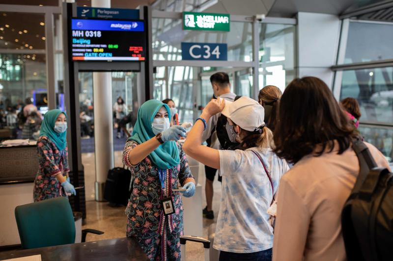 A Malaysia Airlines employee checking the temperature of Chinese passengers before they board a flight to Beijing at the Kuala Lumpur International Airport on Feb 14, 2020.