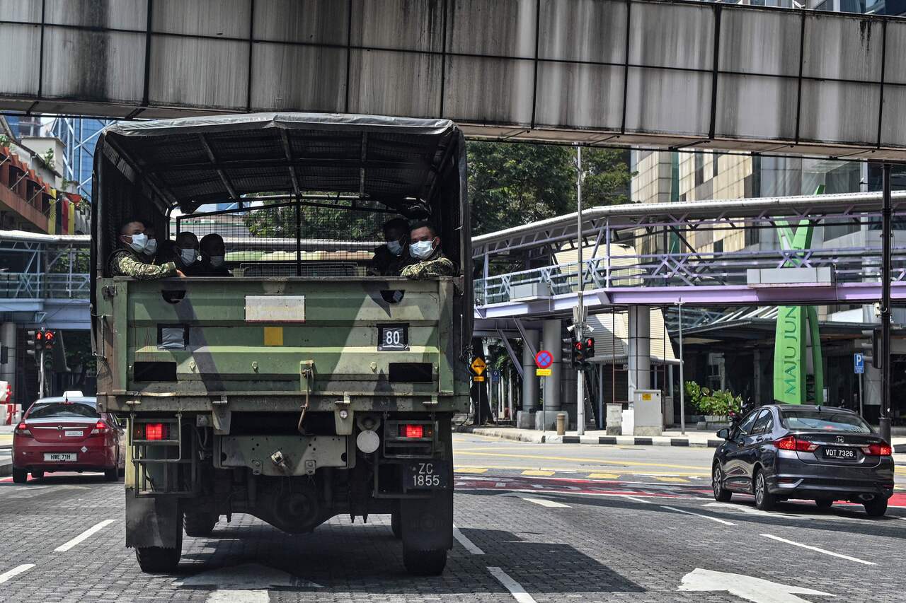 Soldiers wearing face masks look out from an army truck during the control of movement in Kuala Lumpur, on March 22, 2020.