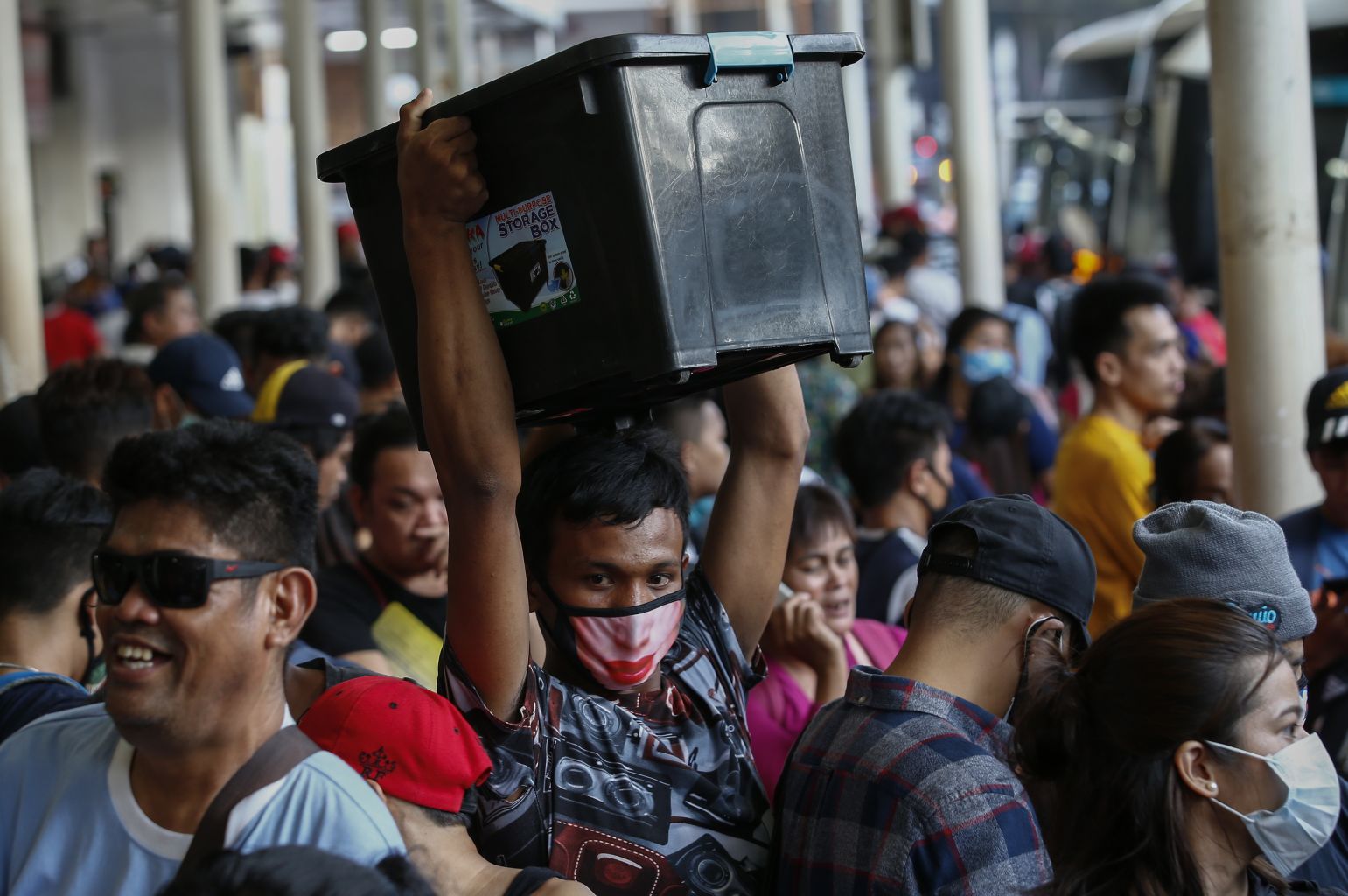 A traveller at the Araneta bus depot carries his belongings through a crowd of other travellers hoping for a bus ride out of the capital region before a community quarantine takes effect.