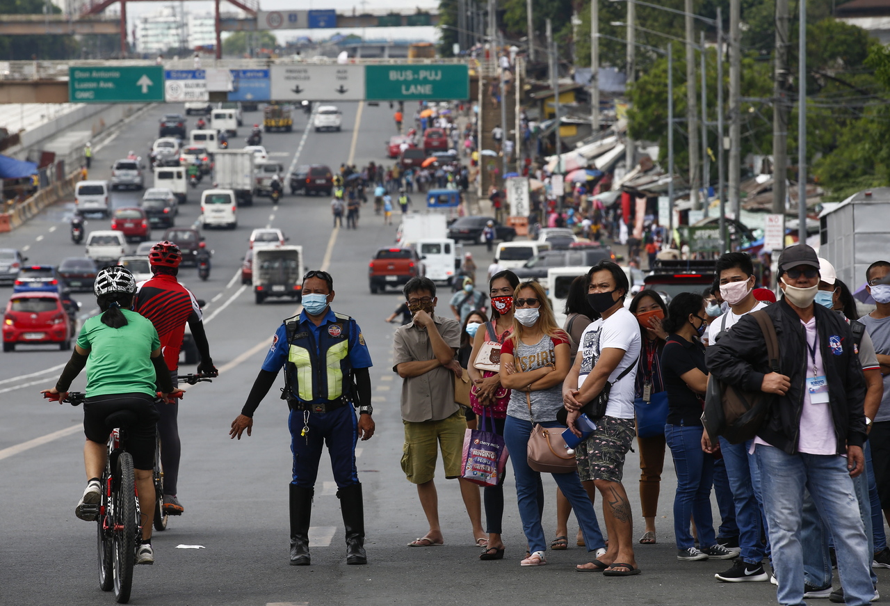 Commuters wait to get a ride along a road in Quezon City, the Philippines, on June 1, 2020.