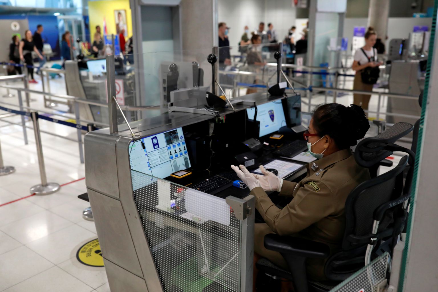 An immigration officer wears a protective mask due to the coronavirus outbreak, as she waits for passengers at Suvarnabhumi Airport in Bangkok, Thailand, on March 12, 2020.
