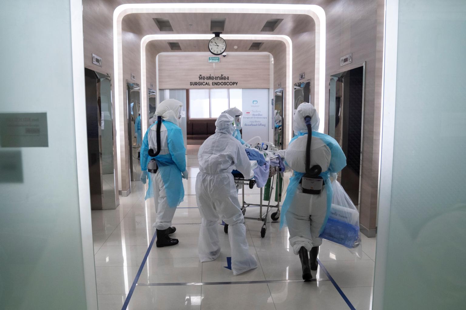 ICU nurses transfer a Covid-19 patient for a CT scan at the King Chulalongkorn Memorial Hospital in Bangkok on April 23, 2020.
