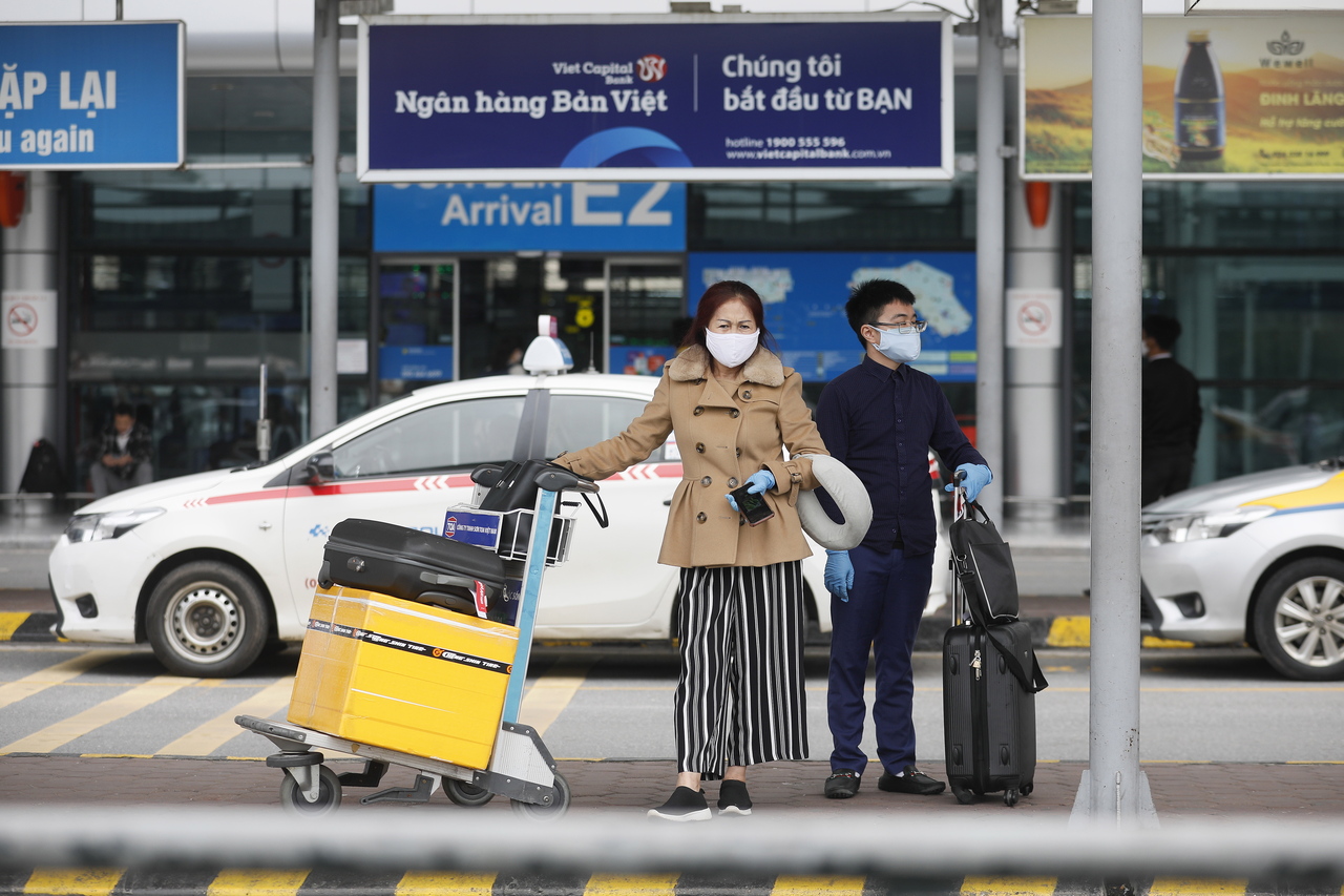 People wearing face masks arrive at Noi Bai International Airport in Hanoi, Vietnam, on March 20, 2020.
