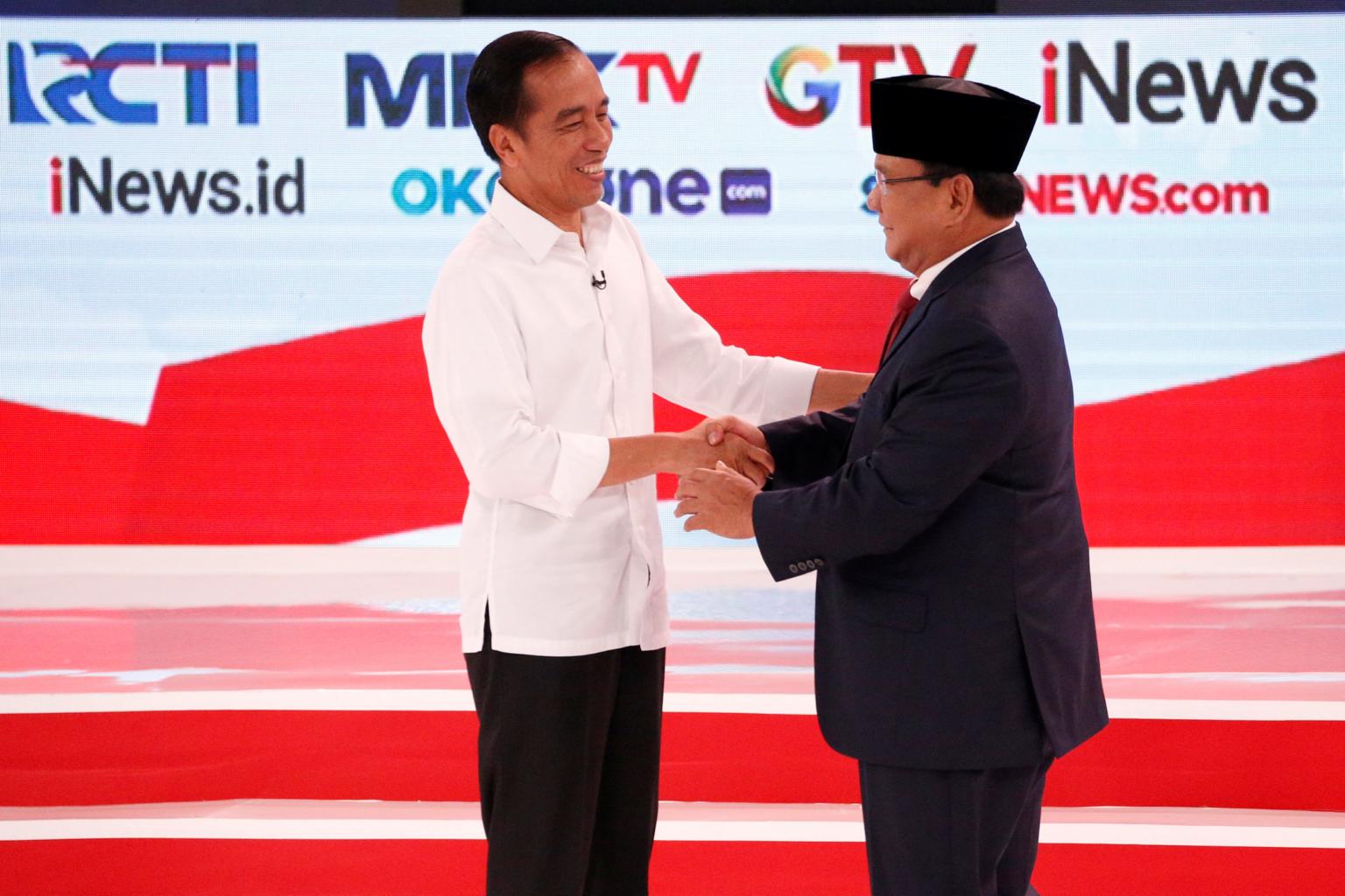 Indonesia's presidential candidates Joko Widodo (left) and Prabowo Subianto after the second debate between presidential candidates ahead of the next general election in Jakarta, on Feb 17, 2019.