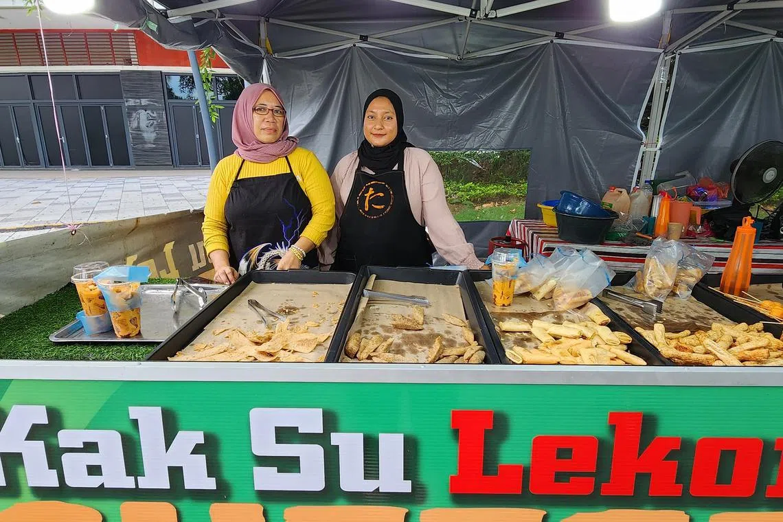 Ms Rina Samil (left) and her business partner Indah Zulkifli at their stall selling fried fish crackers in Forest City.