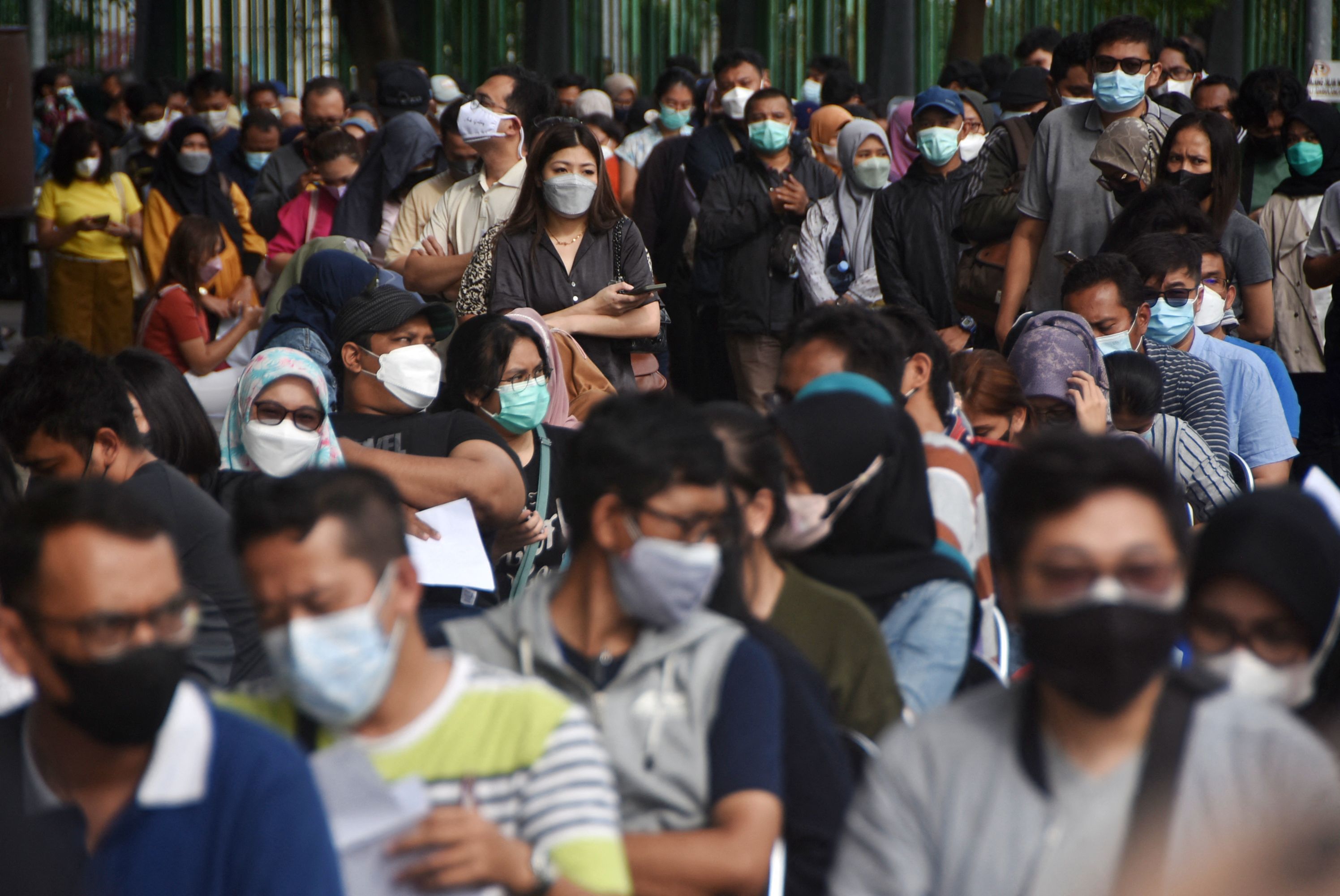 People queue to get a booster shot vaccine for the Covid-19 coronavirus in Bekasi, Indonesia on Feb 5, 2022.