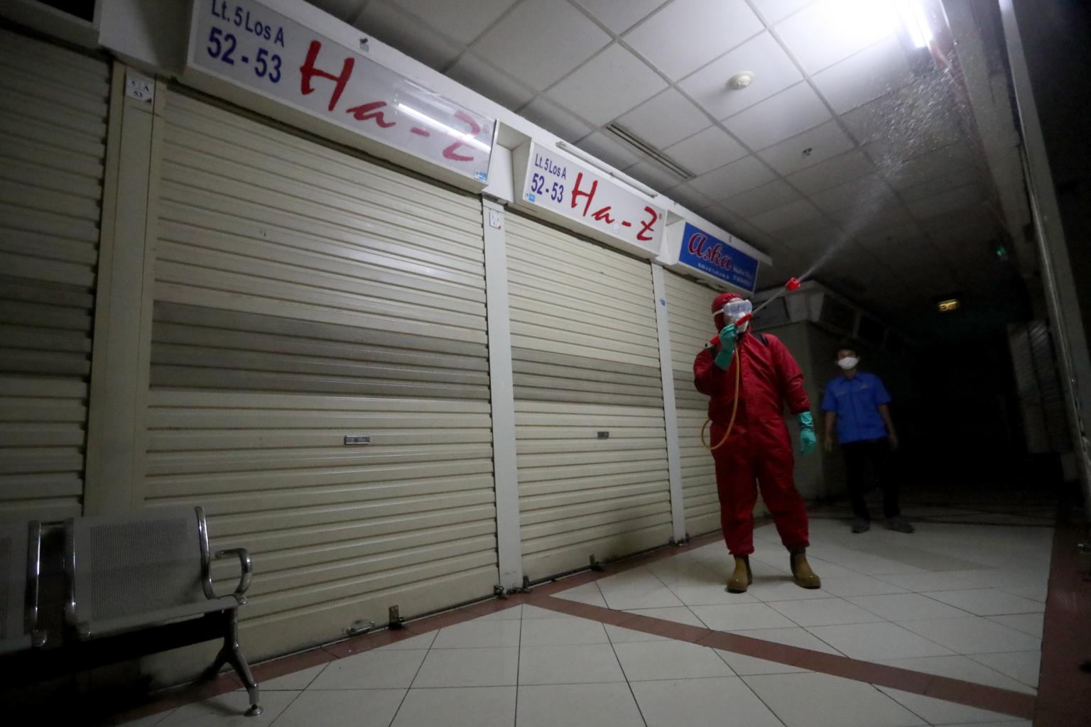 A fireman sprays disinfectant at Pasar Tanah Abang, in Jakarta, on June 4, 2020.