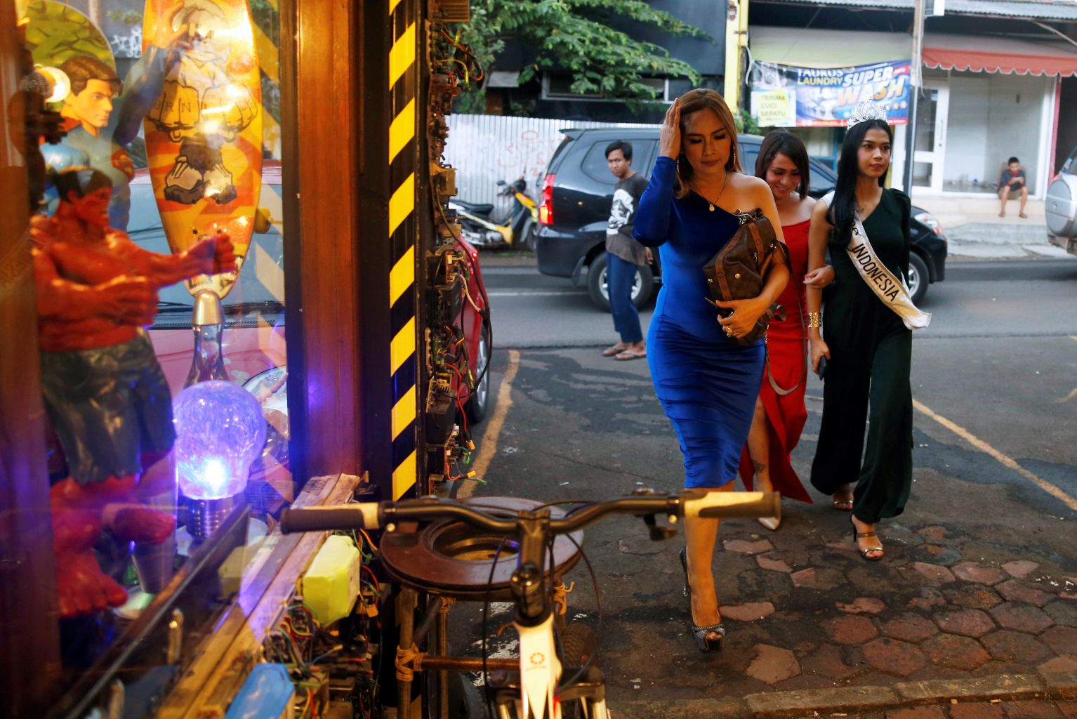 Transvestitves walk near a cafe in Jakarta, on Feb 8, 2018.