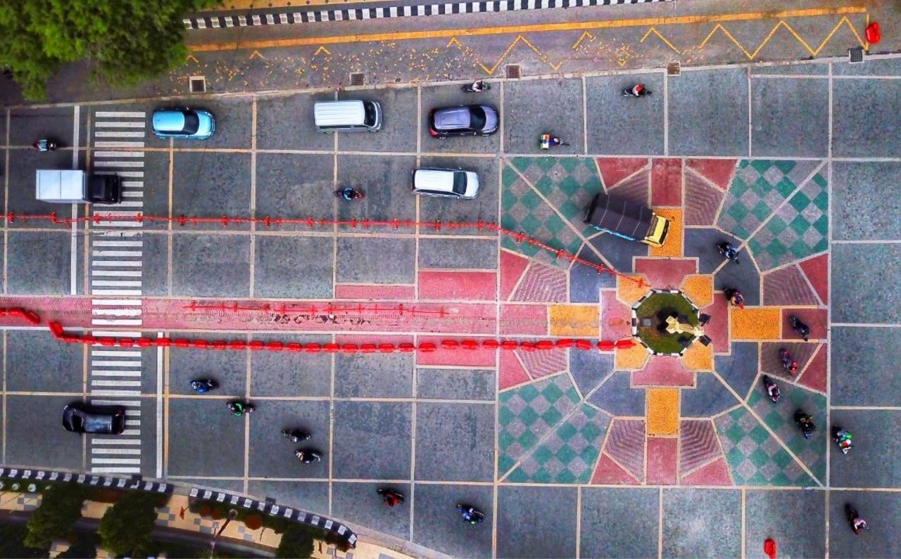 An aerial view of the mosaic street art in front of Surakarta's City Hall. Some have said the design resembles a Christian cross.