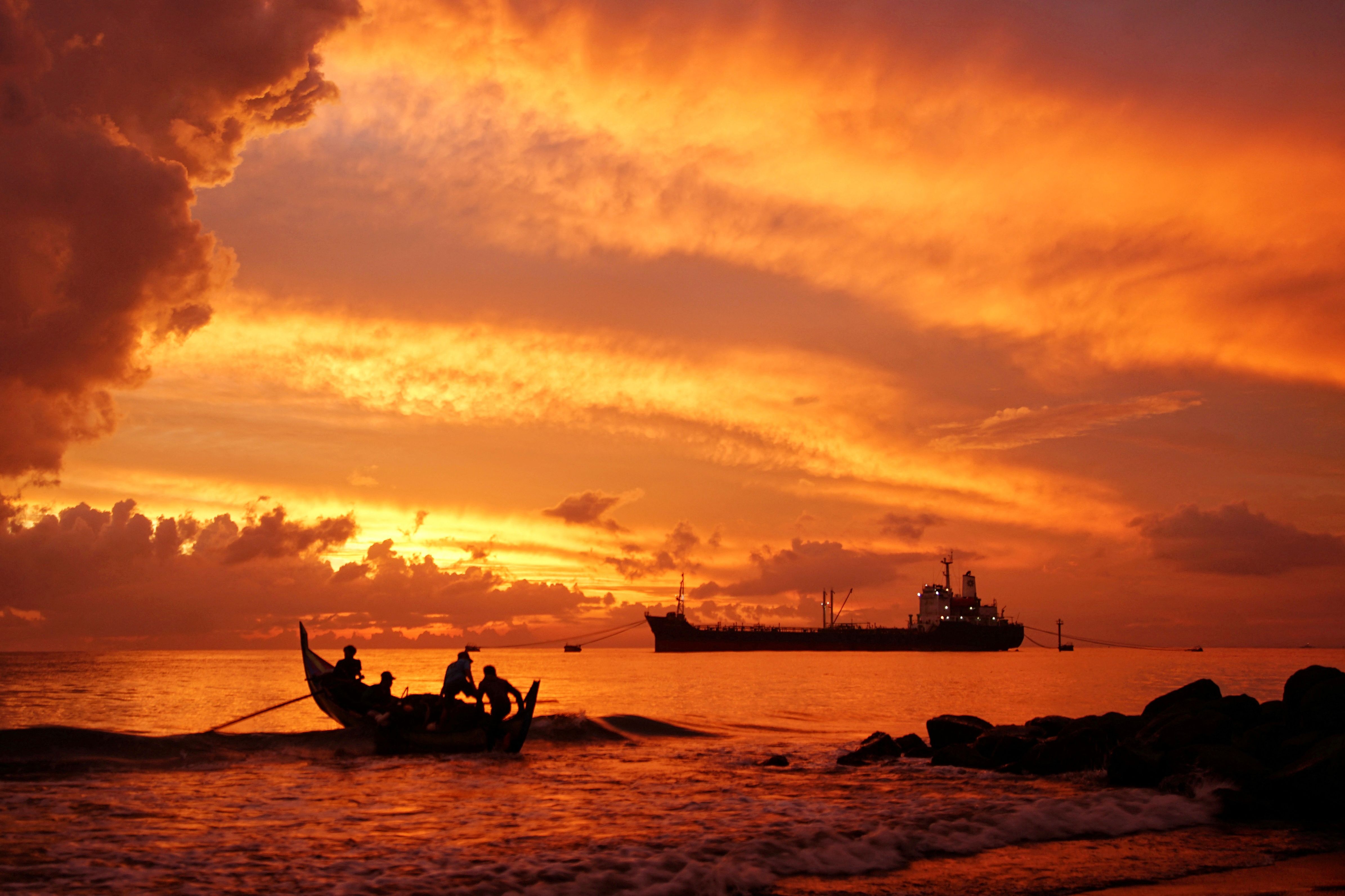 A fishing boat (left) heads out to sea at dawn in Lhokseumawe, Aceh on Aug 9, 2021.