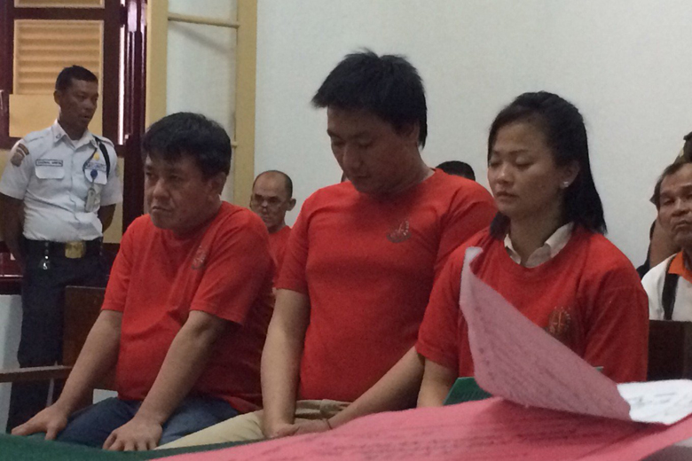 Indonesian drug lord Togiman (left) and his subordinates, married couple Hendy and Mirawati, at the Medan District Court on Dec 19, 2016.