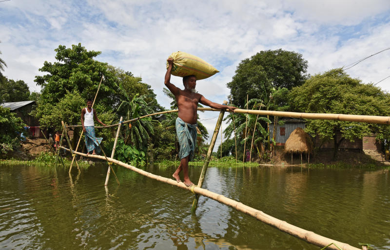 Villagers use a makeshift bamboo bridge to move across flooded areas of Morigaon district in Assam.