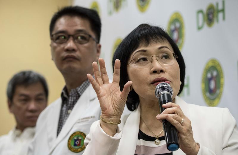 Juliet Sio-Aguilar, pediatrician and head of the Philippine General Hospital expert panel, speaks during a press conference regarding the Dengvaxia vaccine on Feb 2, 2018, while Health Under-secretary Enrique Domingo (centre) looks on.