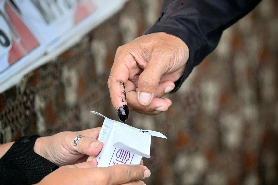 Voters dipping their finger into halal ink to indicate that they have voted, at a polling station in Lebak Bulus, South Jakarta, on Feb 14.