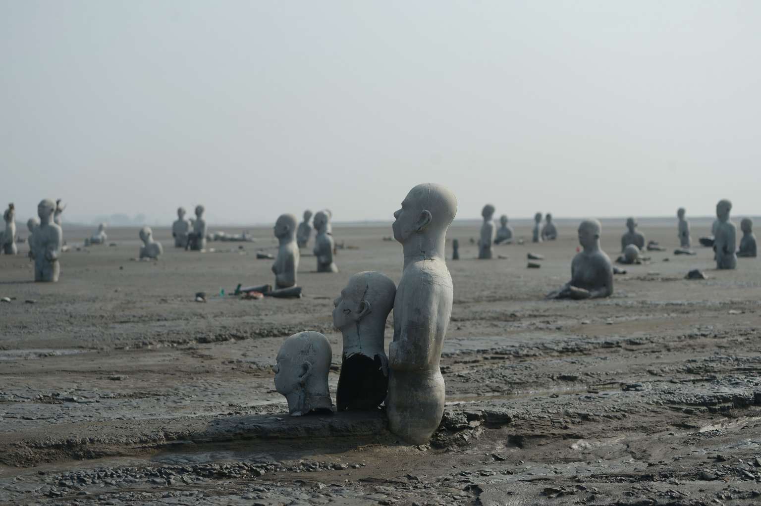Statues standing semi-submerged in mud, a symbol of the human toll of the 2006 disaster, at a mud volcano area in Sidoarjo, East Java, on March 28, 2016.