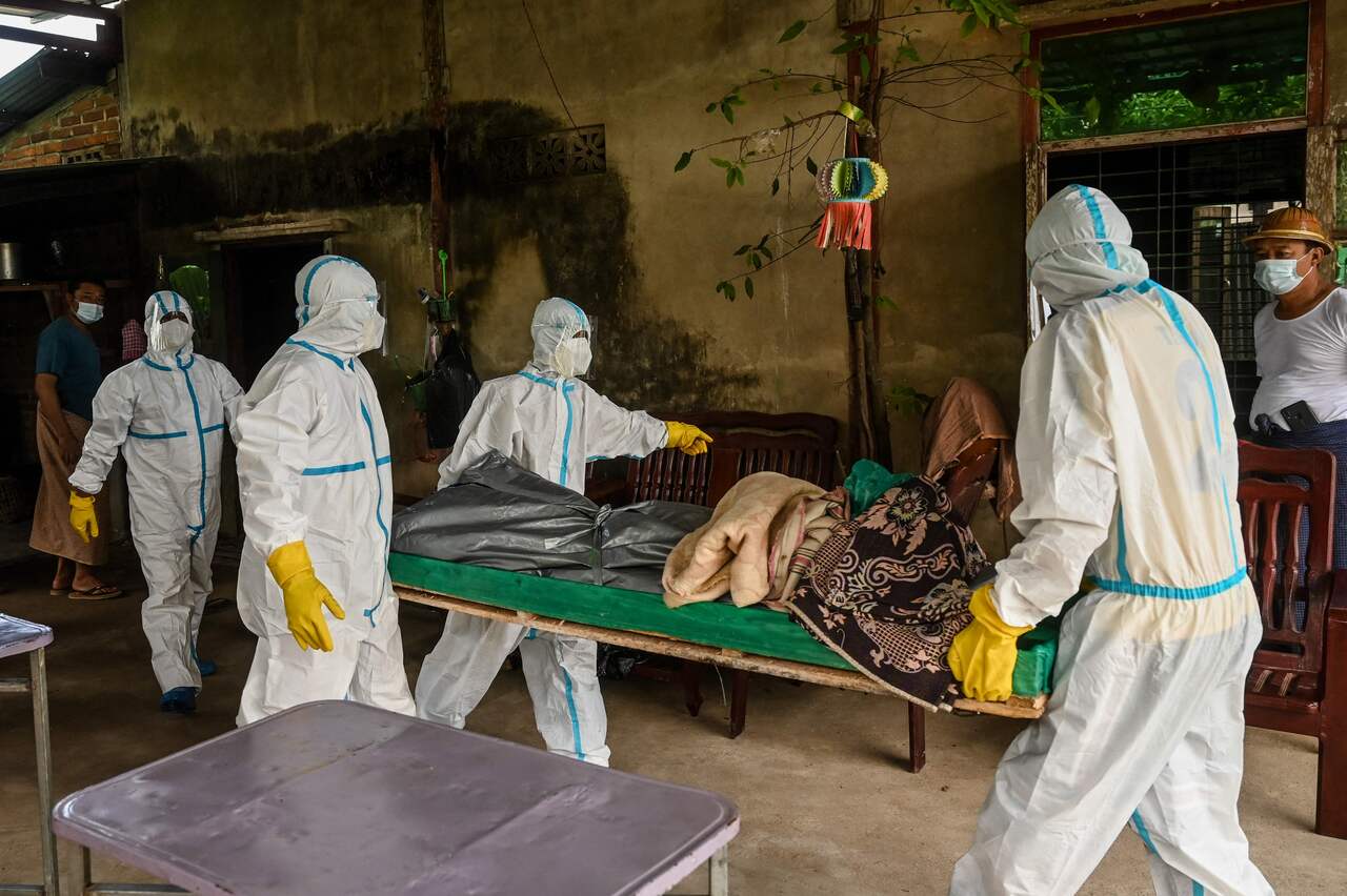 Volunteers carry the body of a Covid-19 victim in Hlegu Township in Yangon, on July 10, 2021.