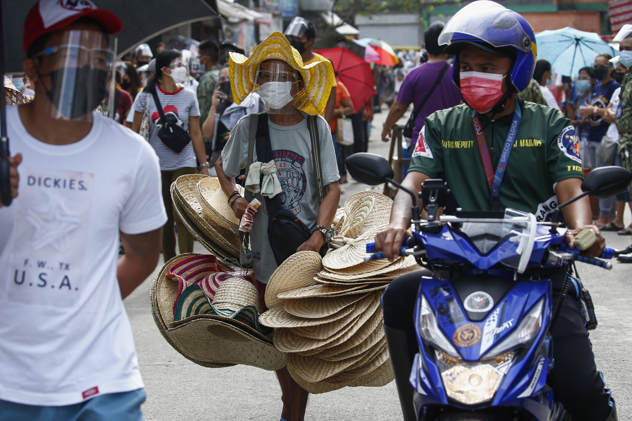 A fan vendor walks past citizens queueing to receive financial aid in Quezon, Philippines, on April 9, 2021.