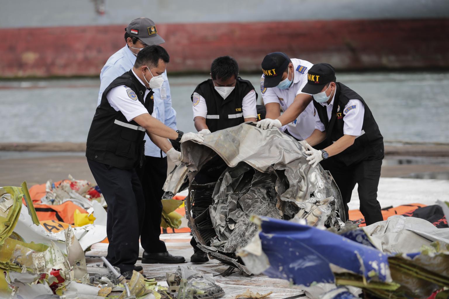 Indonesia's KNKT investigators inspect the debris of Sriwijaya Air flight SJ 182 plane recovered from the crash site on Jan 13, 2021.