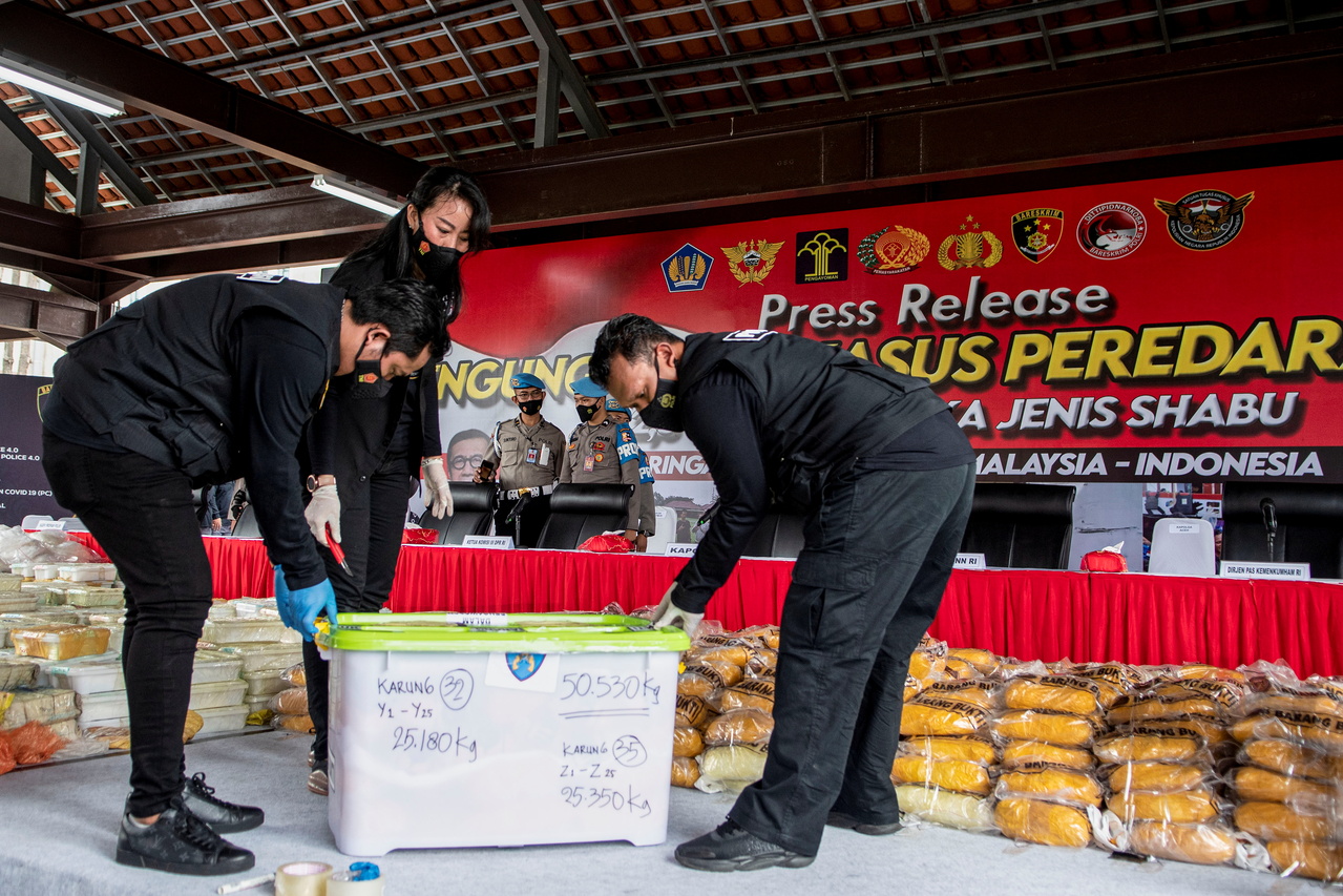 In this photo taken on April 28, 2021, police officers arrange drug evidence after securing 2.5 tonnes of crystal methamphetamine from a drug network spanning South-east Asia in Jakarta.